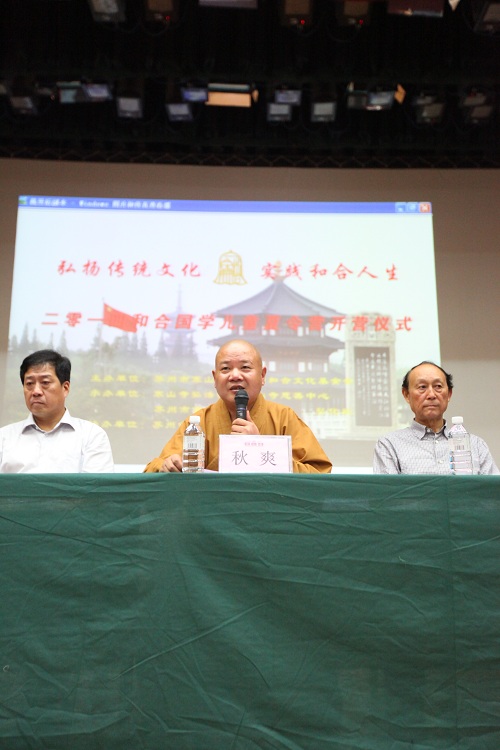 開(kāi)幕式由悟德法師主持,蘇州寒山寺方丈、蘇州和合文化基金會(huì)理事長(zhǎng)秋爽大和尚、蘇州和合文化基金會(huì)秘書(shū)長(zhǎng)吳聲先生、寒山寺文化研究院姚炎祥院長(zhǎng)等分別做了重要講話。此外還邀請(qǐng)了志愿者及營(yíng)員代表發(fā)言。秋爽大和尚開(kāi)示時(shí)指出:“舉辦此次兒童夏令營(yíng),主要是為了讓孩子們接觸傳統(tǒng)文化,認(rèn)識(shí)和合思想,感受?chē)?guó)學(xué)智慧,培養(yǎng)孩子們謙恭禮讓?zhuān)卸飨Ц?,慈?ài)孝順之心?!?/div>